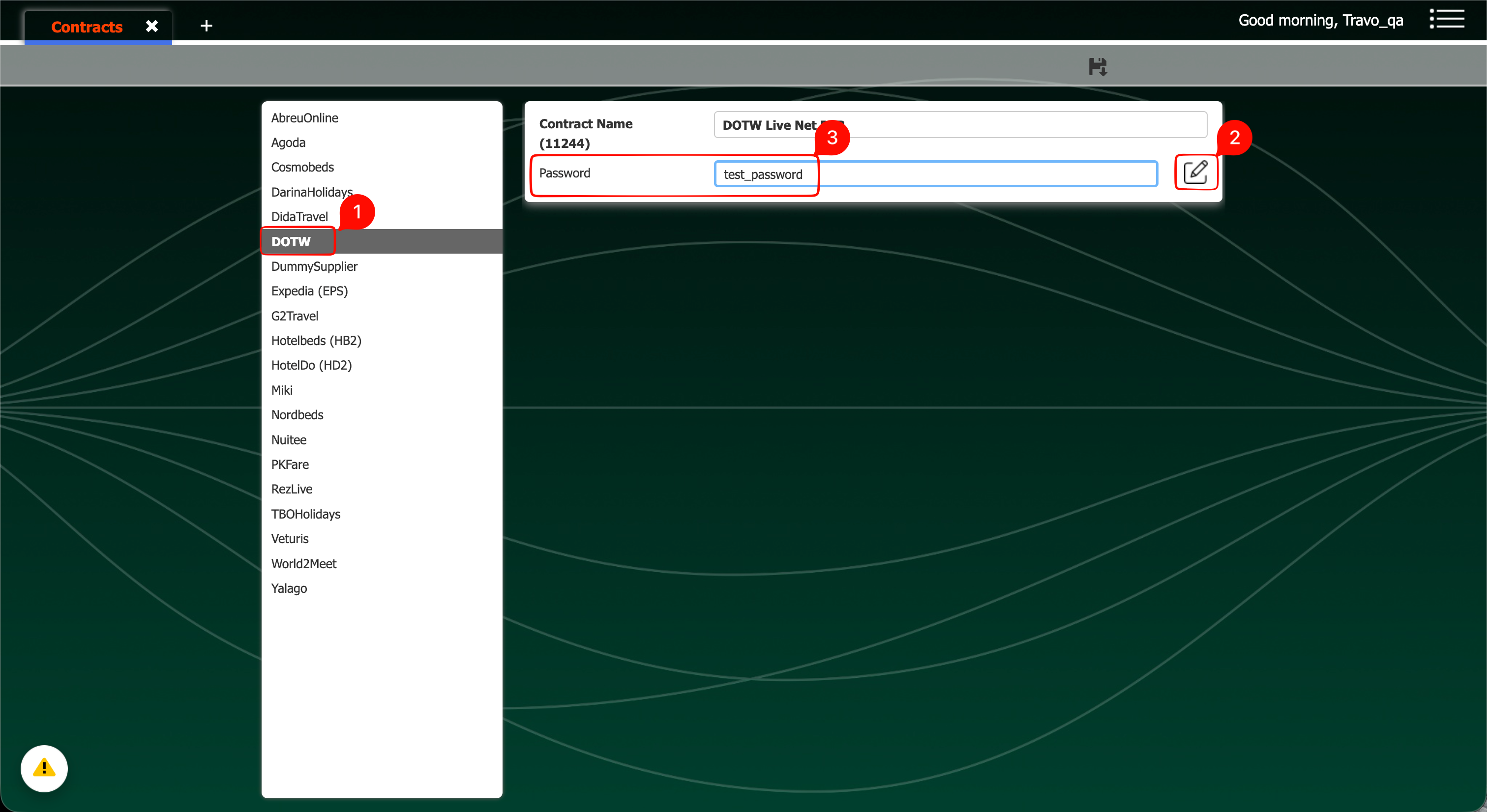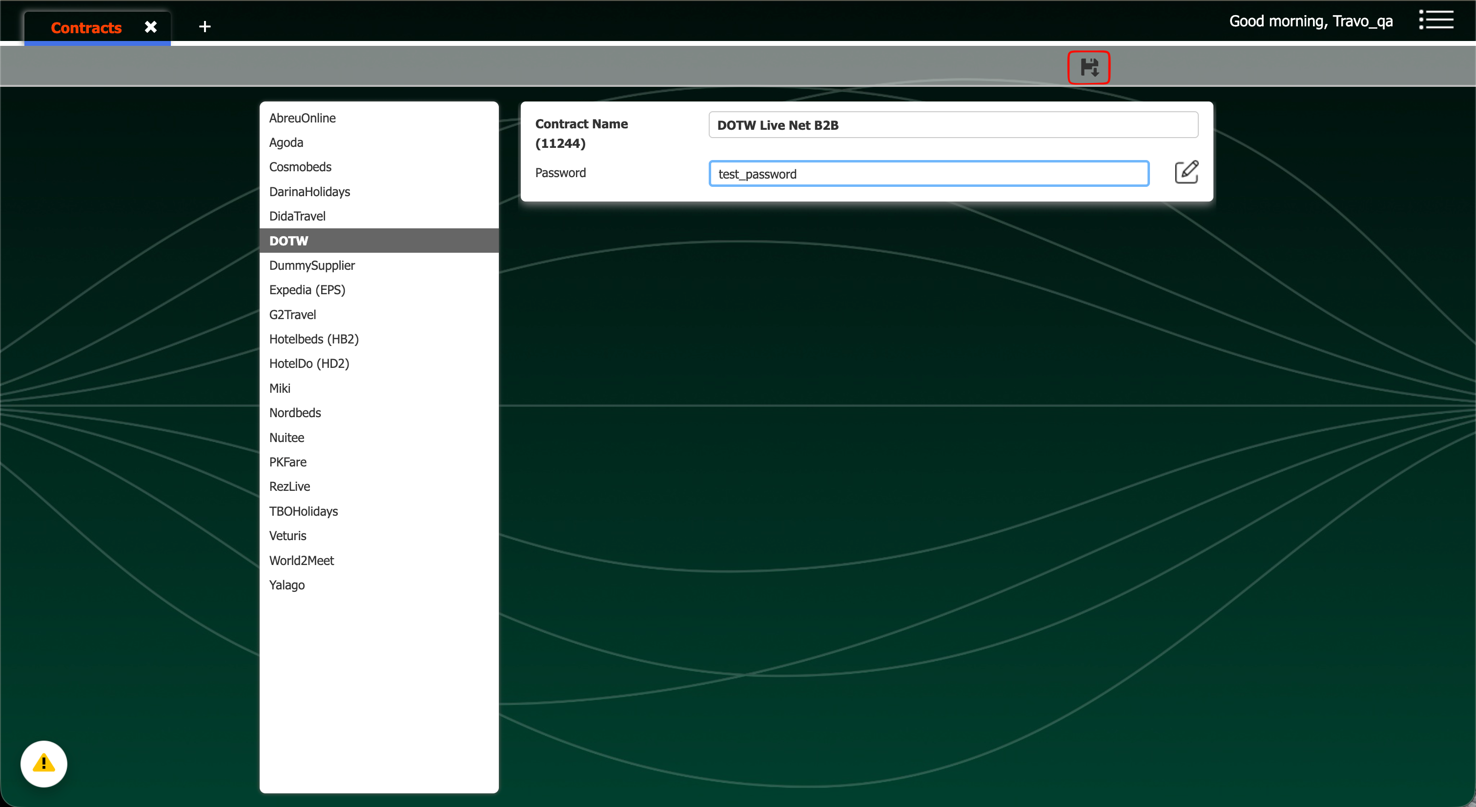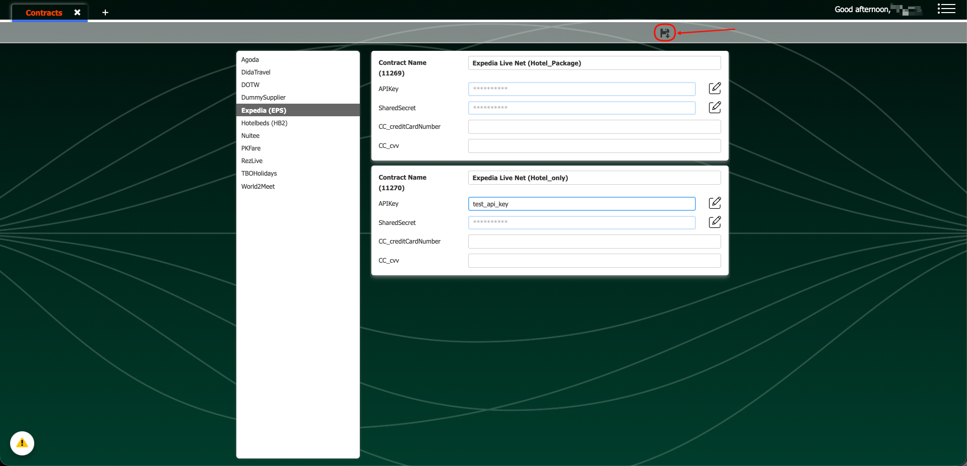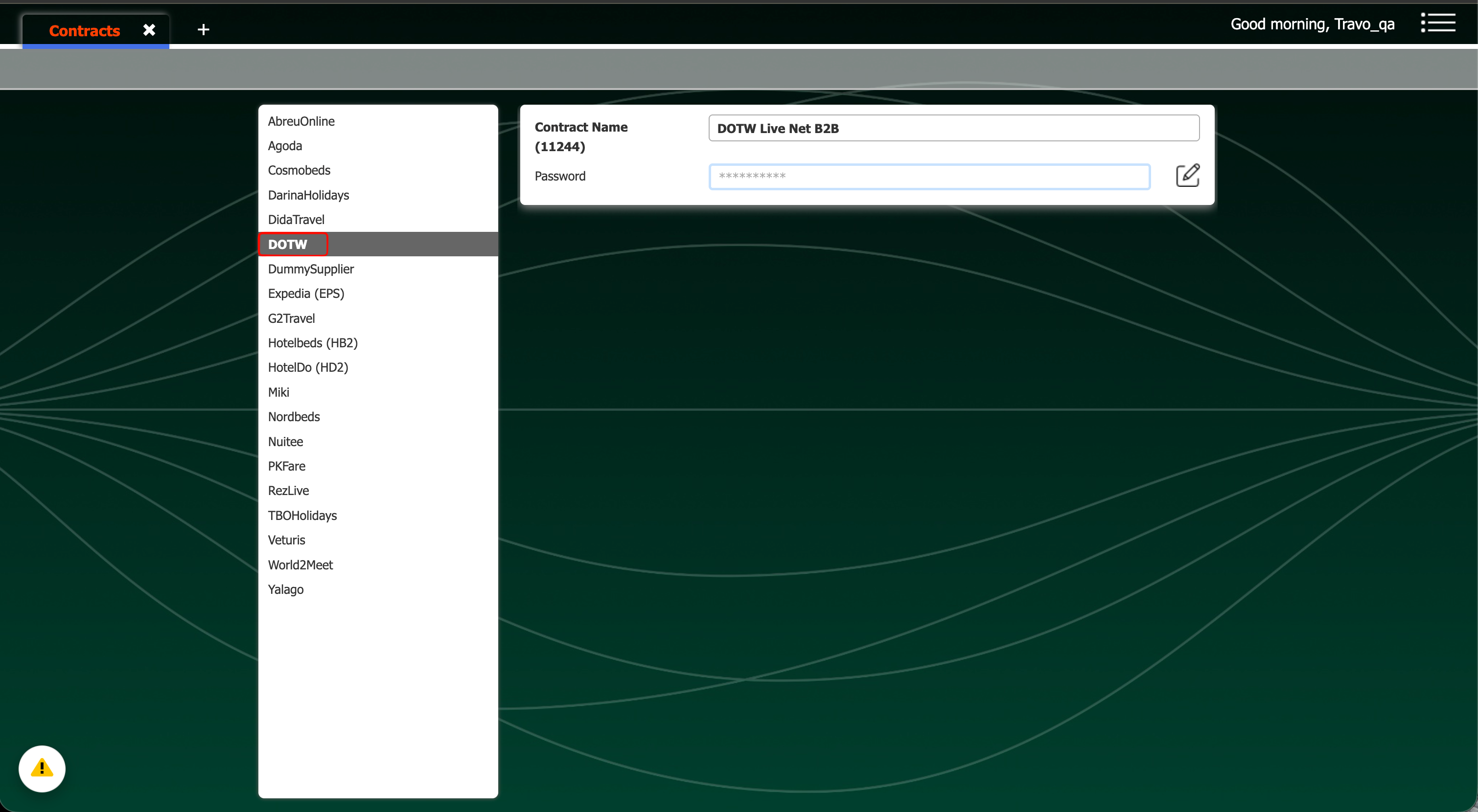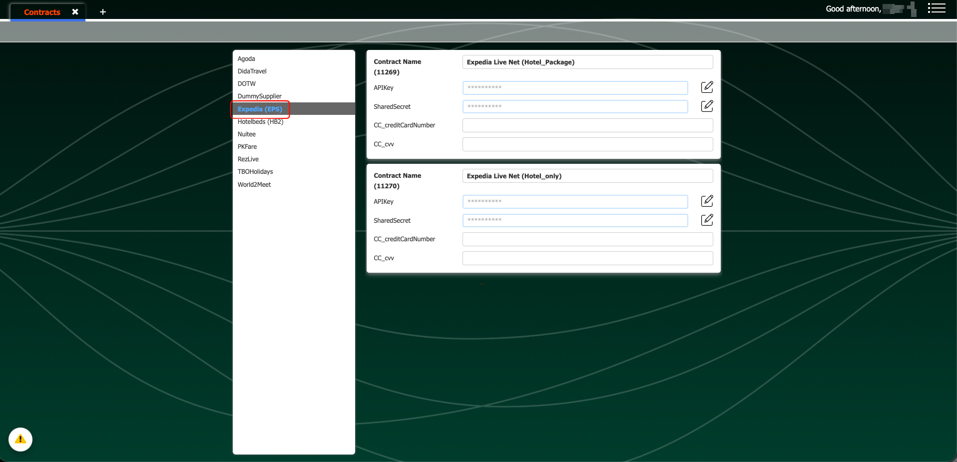 In this section, you’ll find your full list of contracts. Each contract represents a connection with a supplier and includes its specific API keys. A single supplier may have multiple contracts such as B2B, B2C, CUG, and others.This screen lets you connect a new contract, update API keys, passwords, and other sensitive details in a simple and secure way. Once you save the changes, all keys, usernames, and passwords are automatically masked and stored securely.