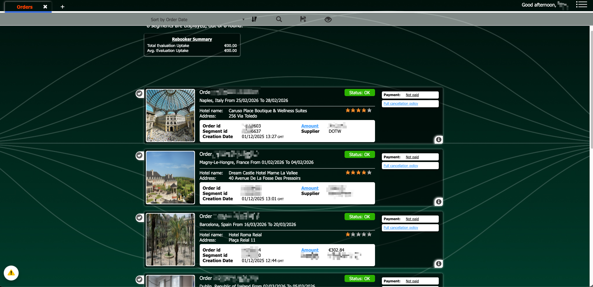 Each order has information about the rooms, payment details, confirmation info etc. In addition, full cancellation policies are available.