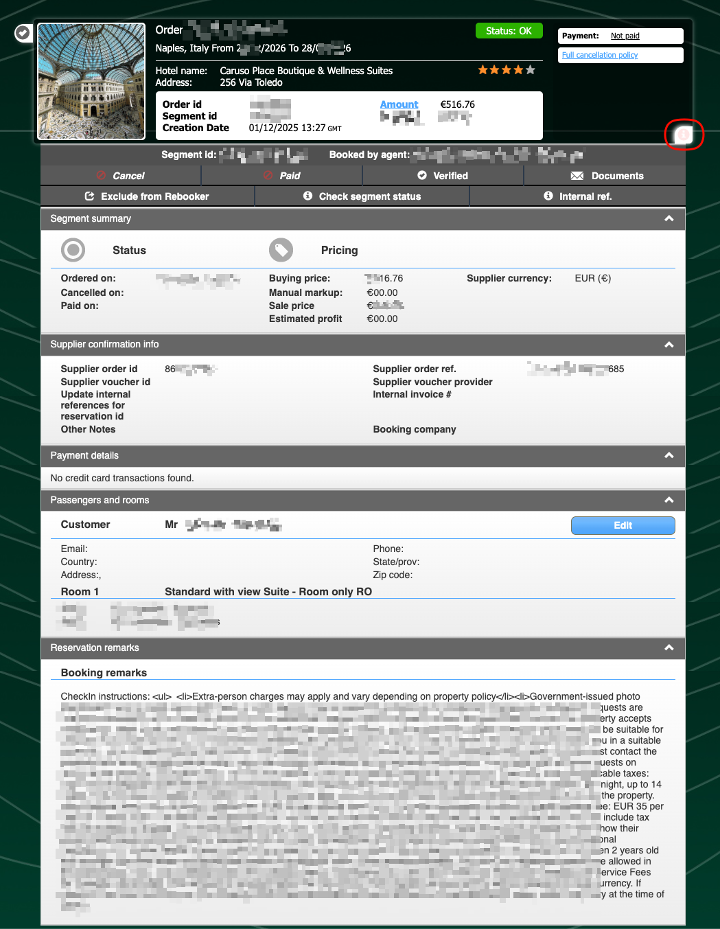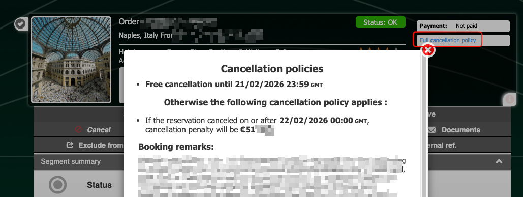 Each order has information about the rooms, payment details, confirmation info etc. In addition, information about payment status, cancellation policy (and full cxl policy details) are available.